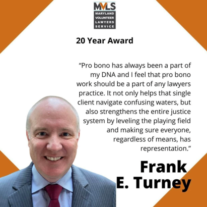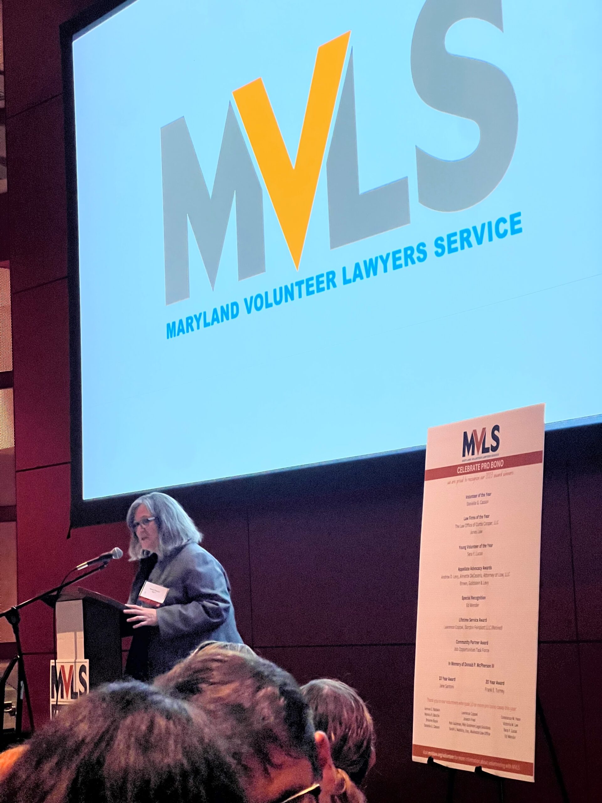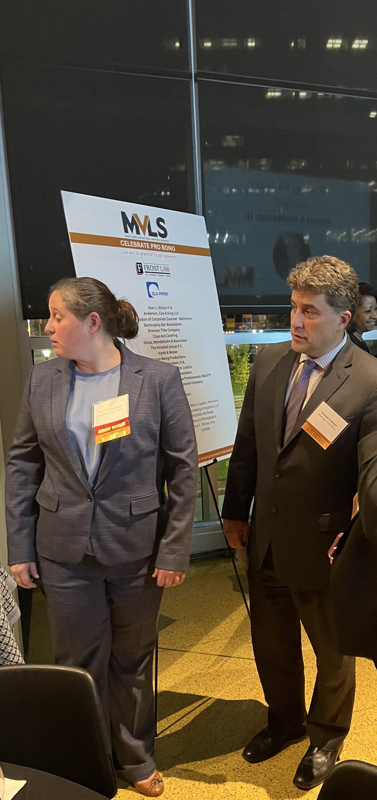 October 17, 2023 – MVLS Annual Awards Gala. HCBA Members recognized for service. Frank Turney of www.turneylawfirm.com was recognized for twenty (2) years of dedicated service to pro bono case work with MVLS. Frank focuses his work on bankruptcy, criminal defense, and personal injury. He is an active member of HCBA and even donated flying lessons to the silent auction at the Crab Feast. Also honored was Attorney Sarah Nadolny of MLO/Mulinazzi Law Office (www.mulinazzi.com) for her service in working ten+ MVLS custody and divorce cases this year. A big thank you to all HCBA members who help low-income litigants protect their rights through pro bono/low bono volunteer representation. To find out more about how you can help, contact Margaret Henn at www.mvlslaw.org.